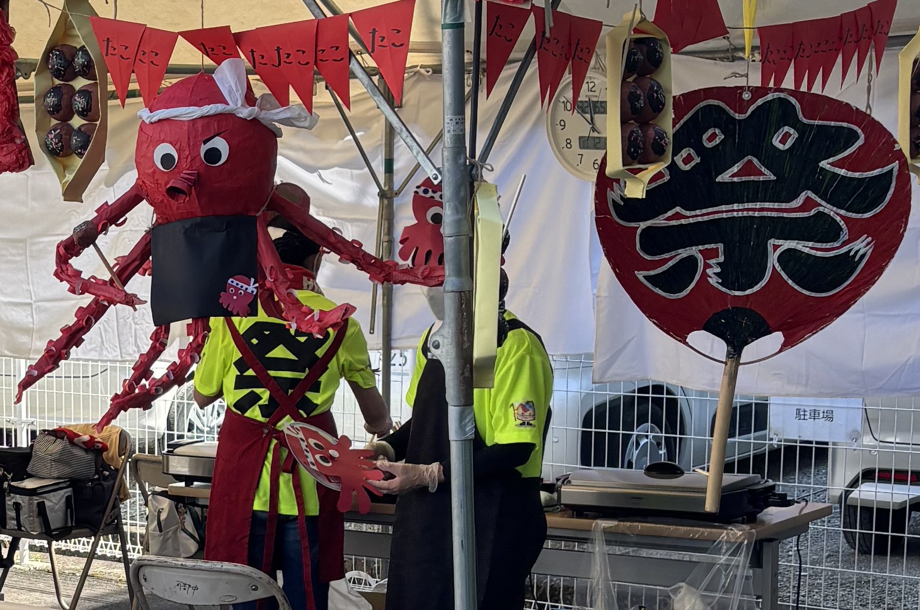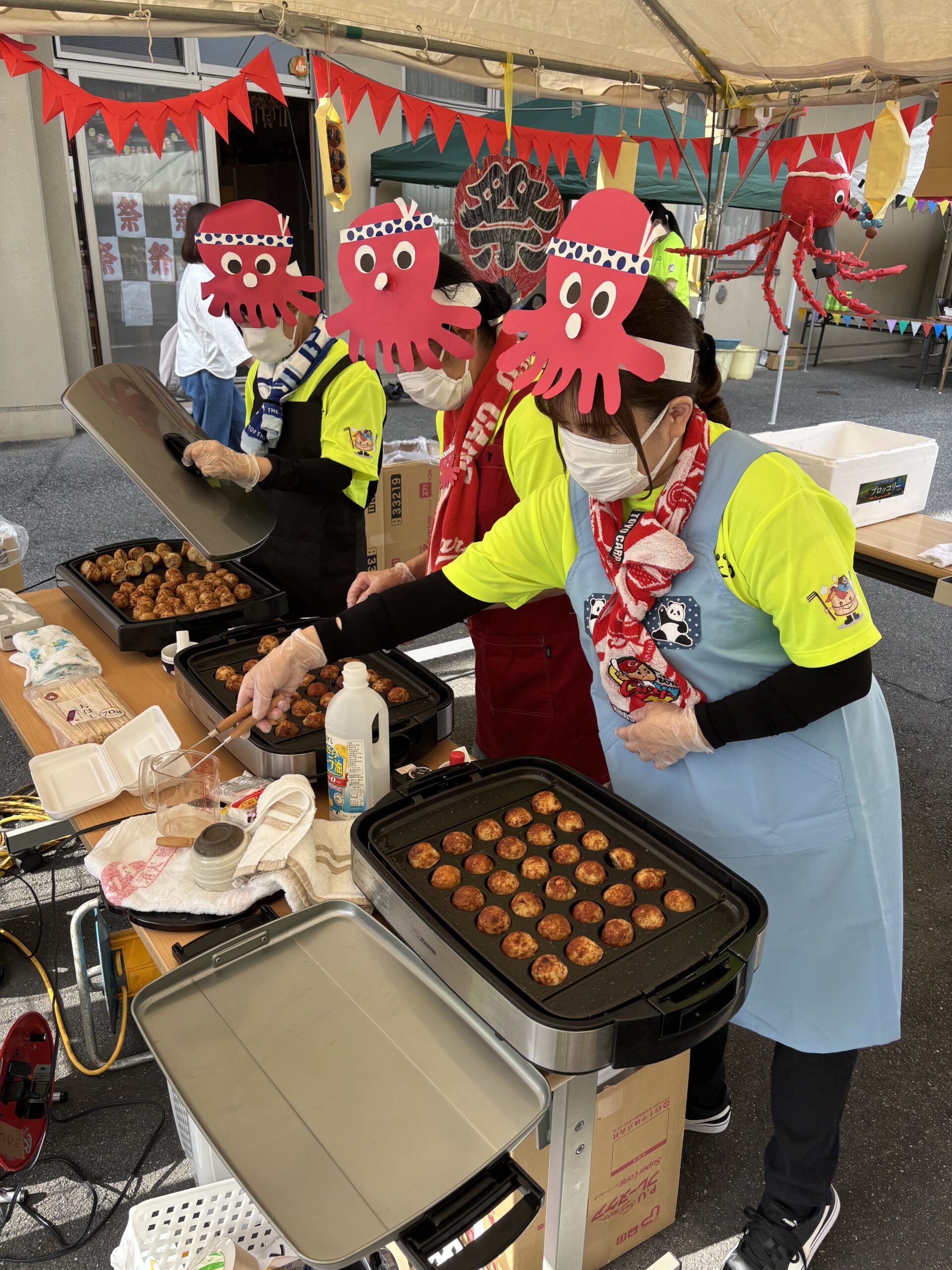 職員の頭に乗ってるタコの被り物は職員の手作り品で、たこ焼をお買い上げいただいたお客様にもプレゼントし大変好評いただきました。