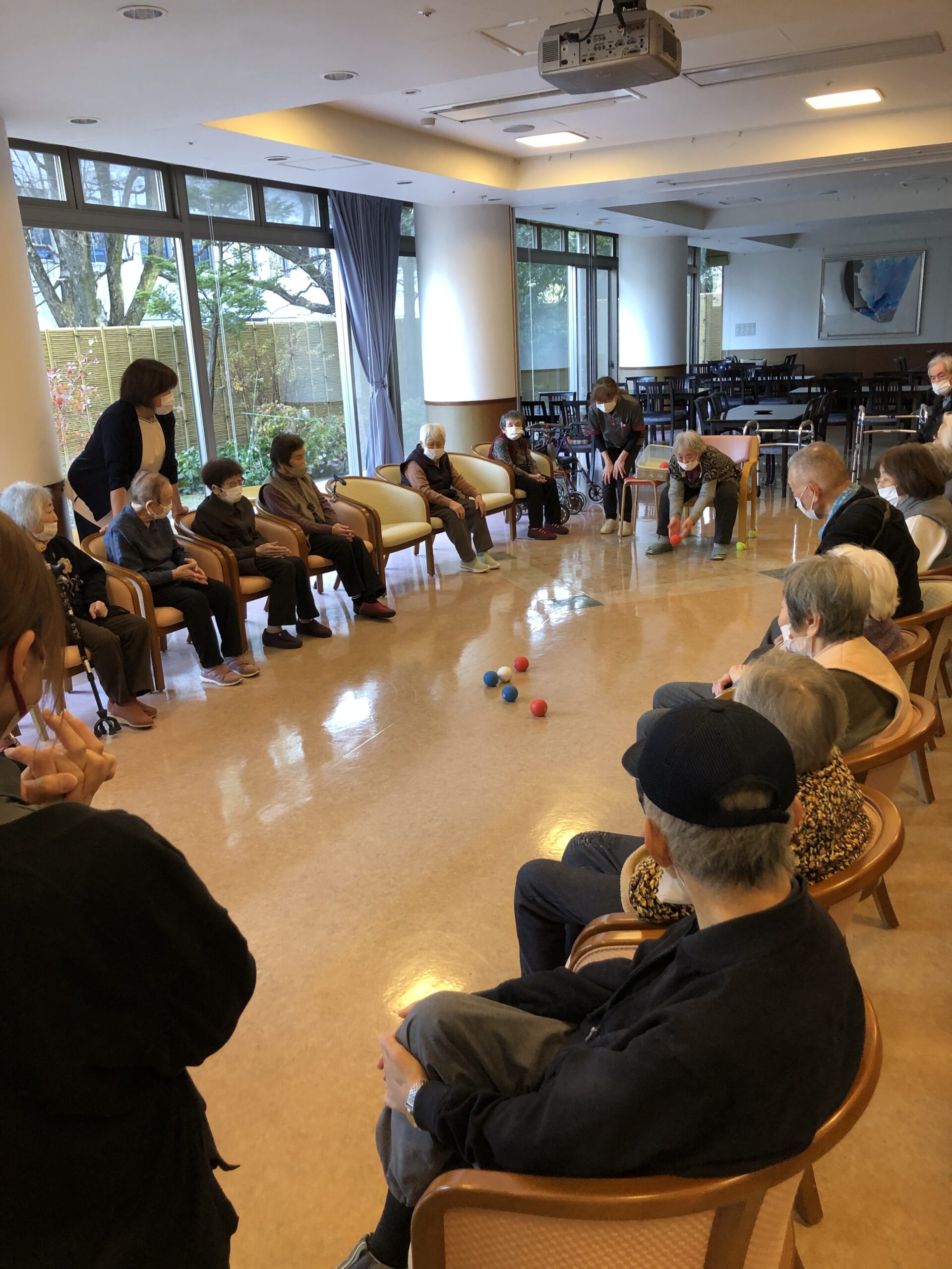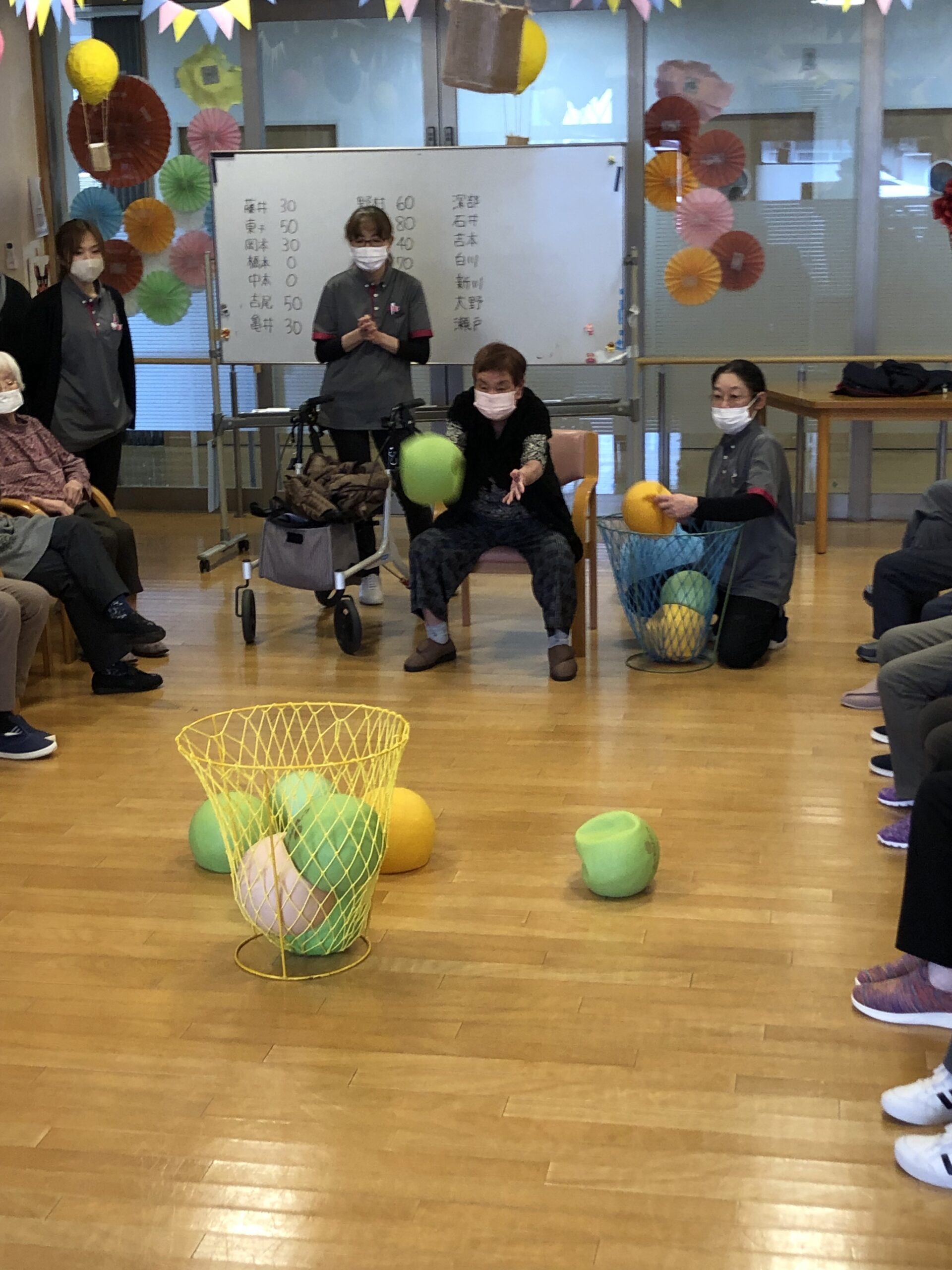 ゲームレクは種類が豊富です。玉入れ、ボウリング、ボッチャ、、、時には巨大サイコロを放り投げることも!