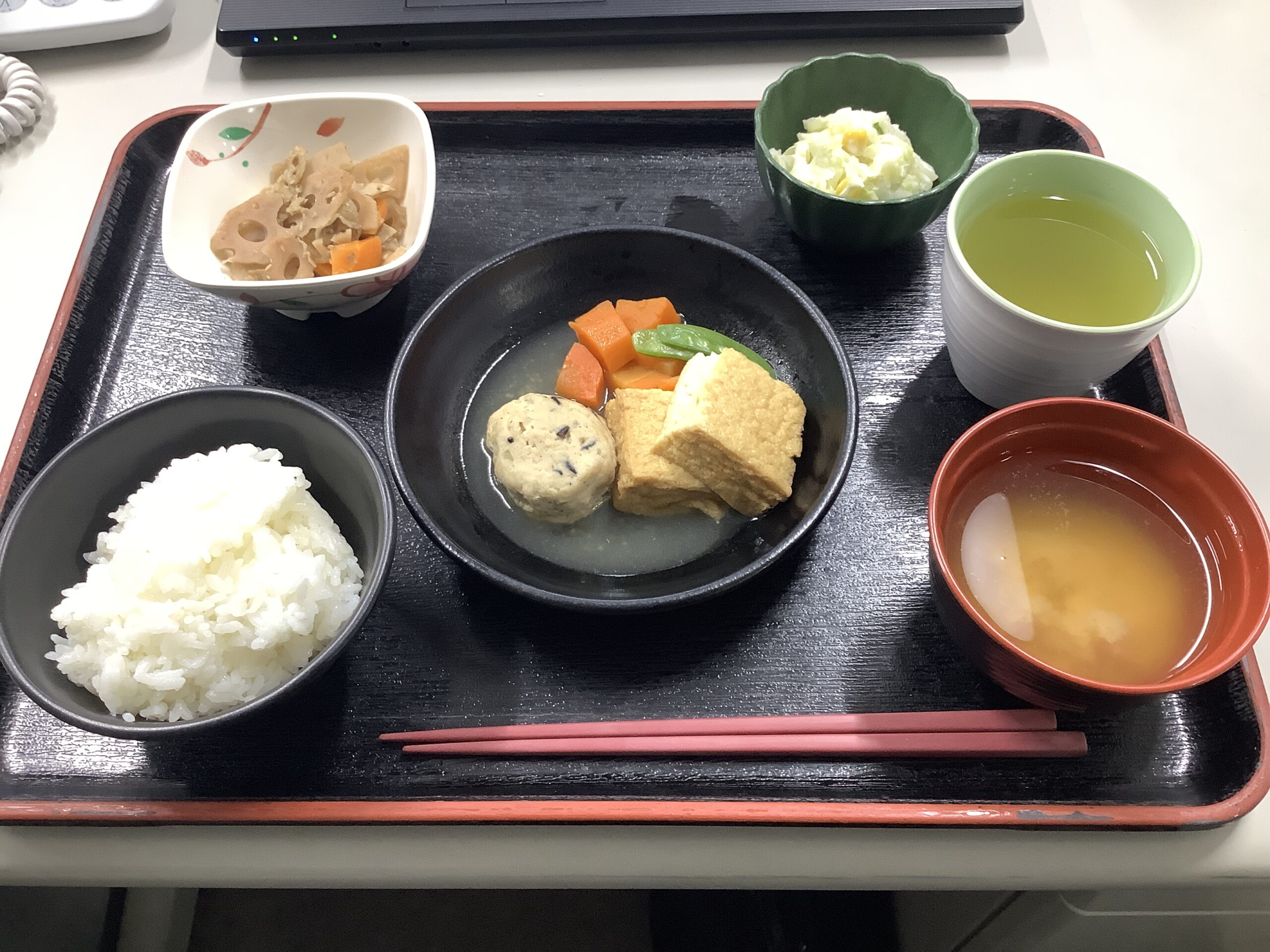 ごはん、絹揚げの炊き合わせ、蓮根きんぴら、コールスローサラダ、味噌汁でした。