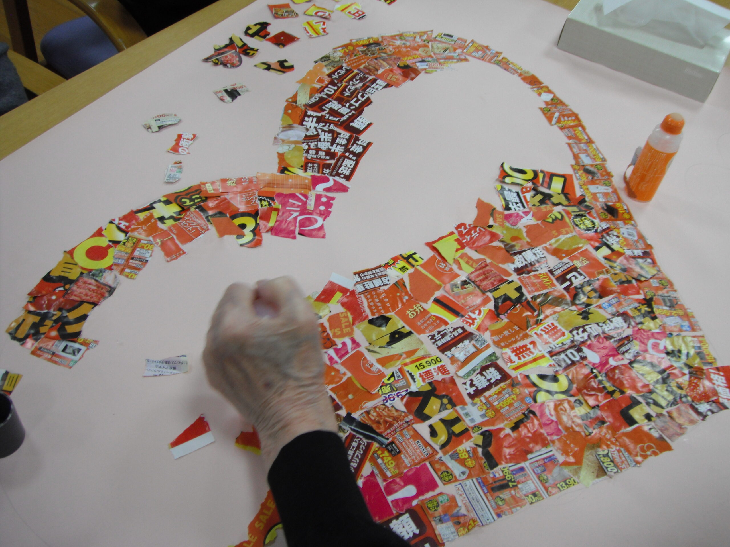 2月の壁画制作の様子です。新聞の広告をちぎって上手に入居者の方が貼ってくれています。