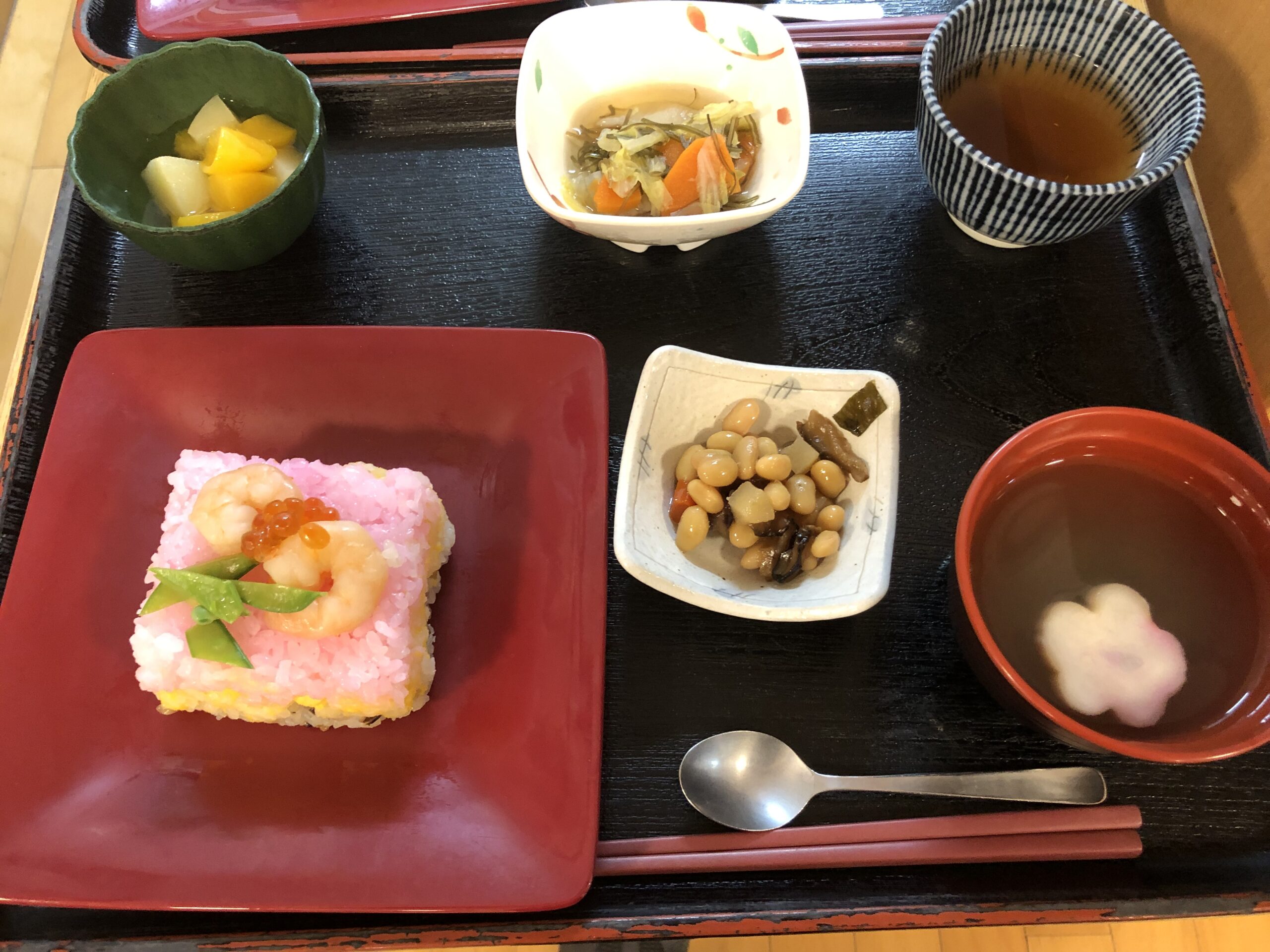 お昼のメニューです。菱餅に見立てた3層構造の【ひな寿司】がメインになります。