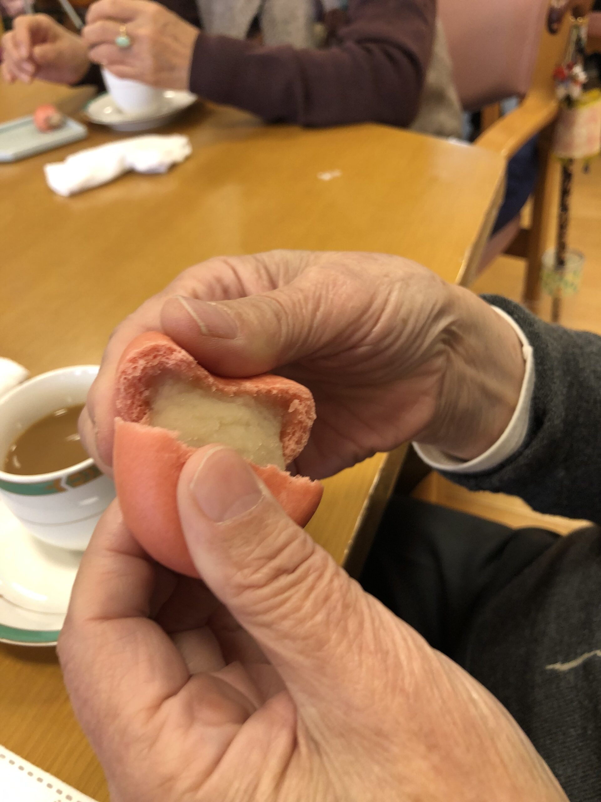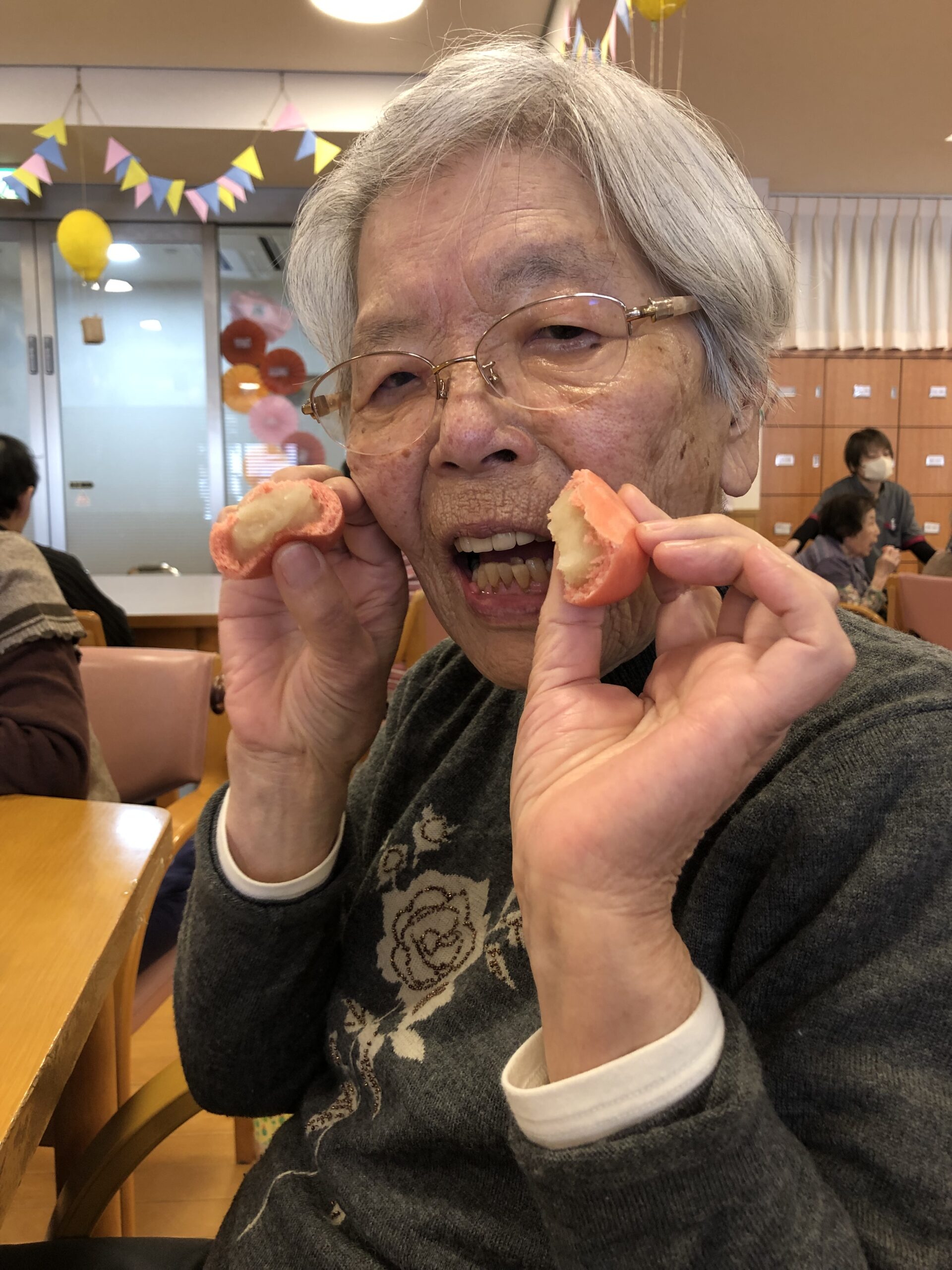 おやつは【ひなあられ】、、、では硬くて食べれない方がいるので、【福まんじゅう】をご用意しました。